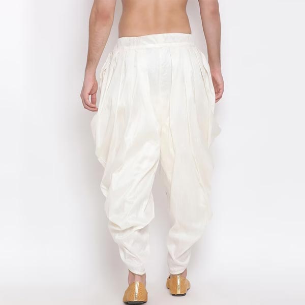 White mid-rise dhoti pant with gathered and overlapping layered detail, has a waistband with a drawstring fastening