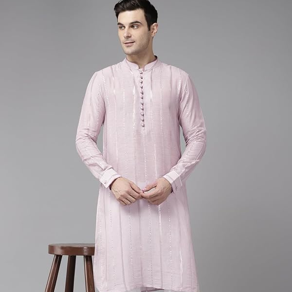 Men Pink Zari Wark Silk Woven Design Staright Kurta, has a mandarin collar, long sleeves, straight hem, two side pockets and side slits